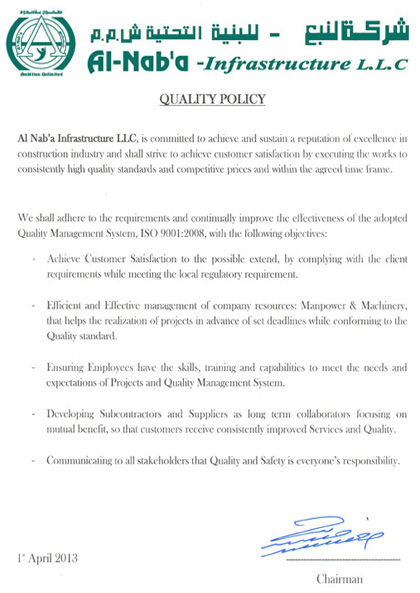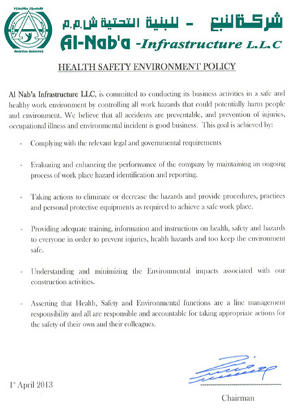 We at Al Nab'a Infrastructure consider Quality, Health, Safety and Environment as an integral part and it is evident in the way we plan, operate all our projects.